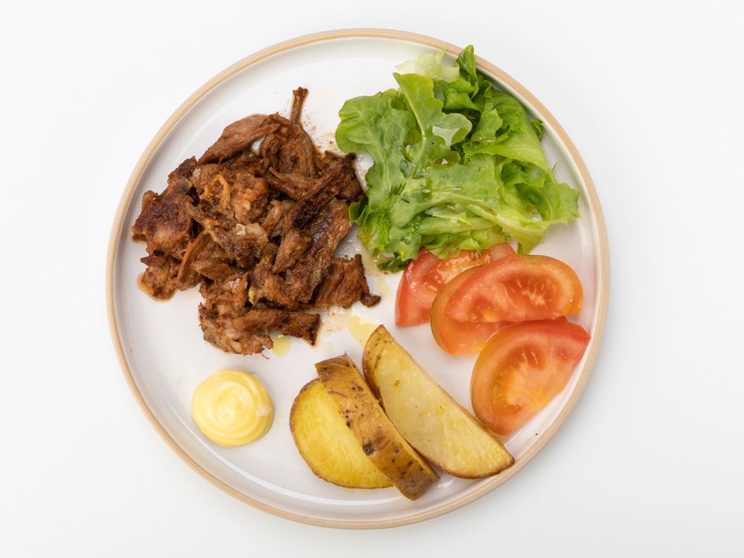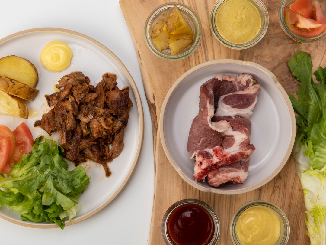 Capocollo di maiale di produzione artigianale, cotto e speziato a bassa temperatura per essere servito a sfilacci con salsa BBQ su un letto a base di taco.