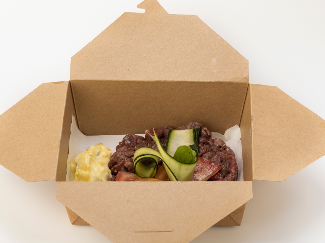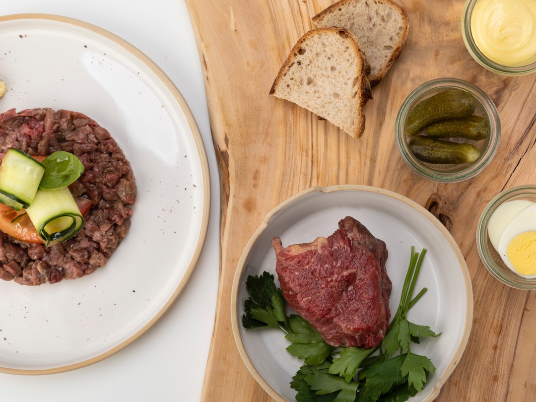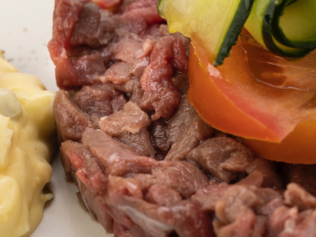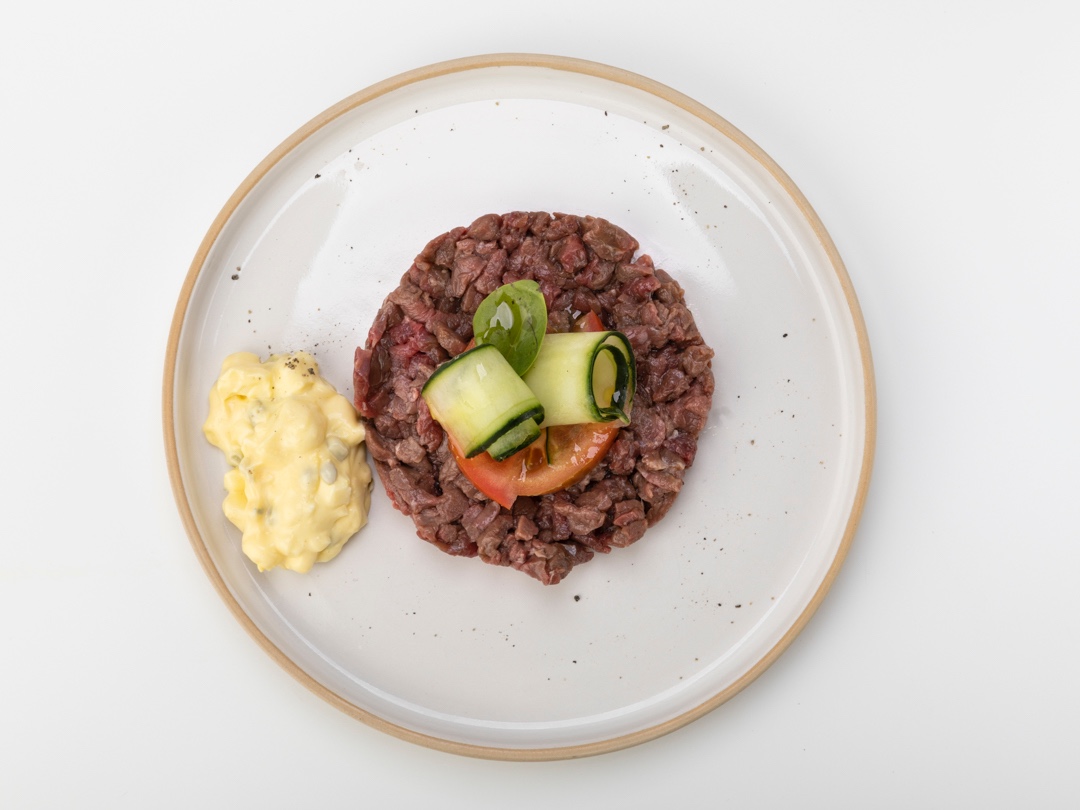 Carne di manzo locale battuta al coltello leggermente condita con sale, olio, pepe, olive, e basilico ed accompagnata da senape e yogurt.