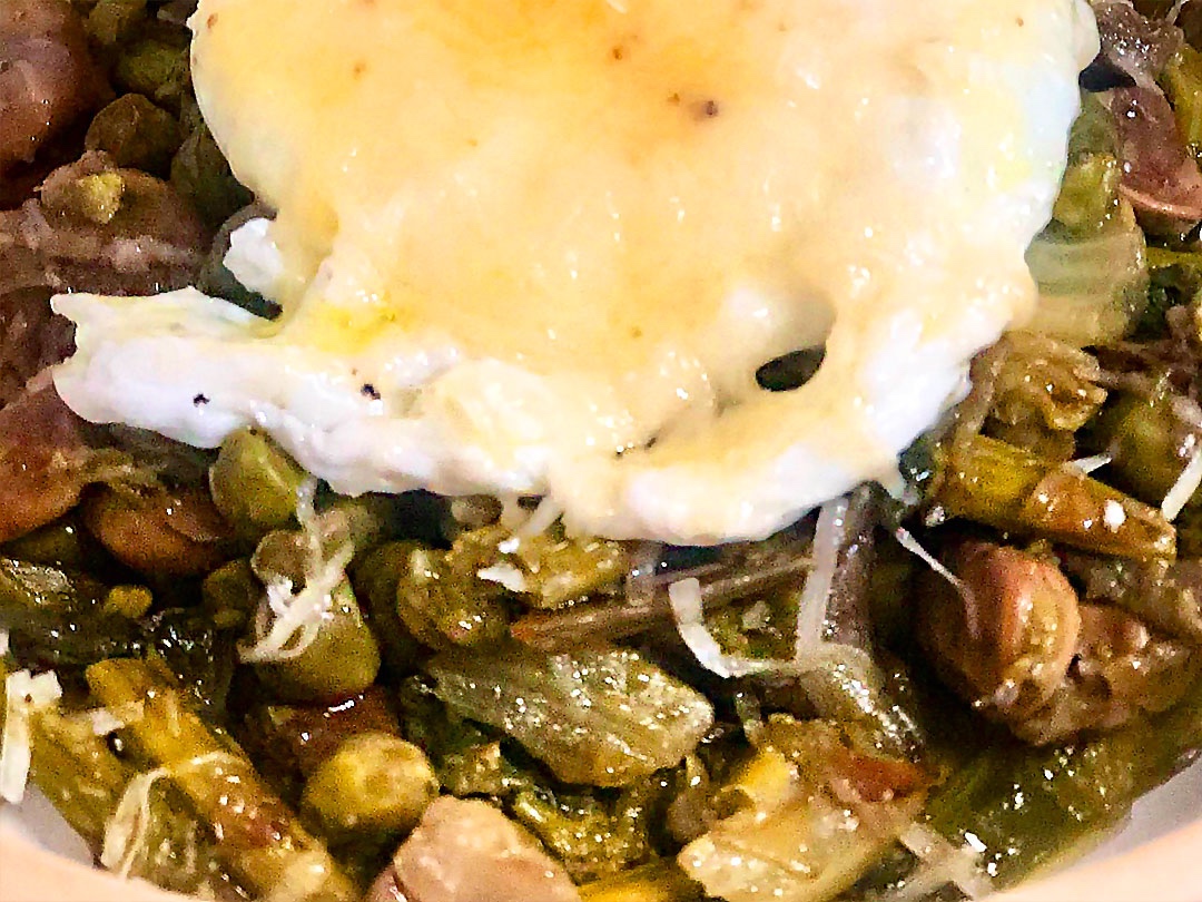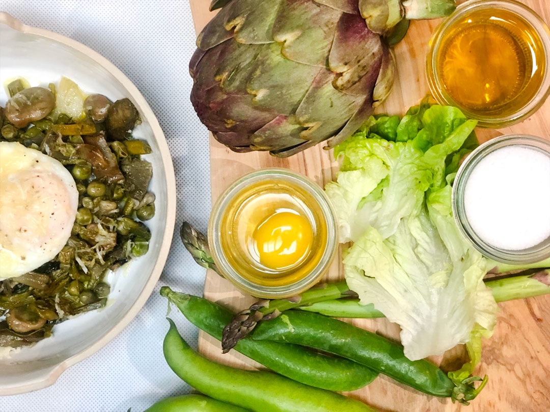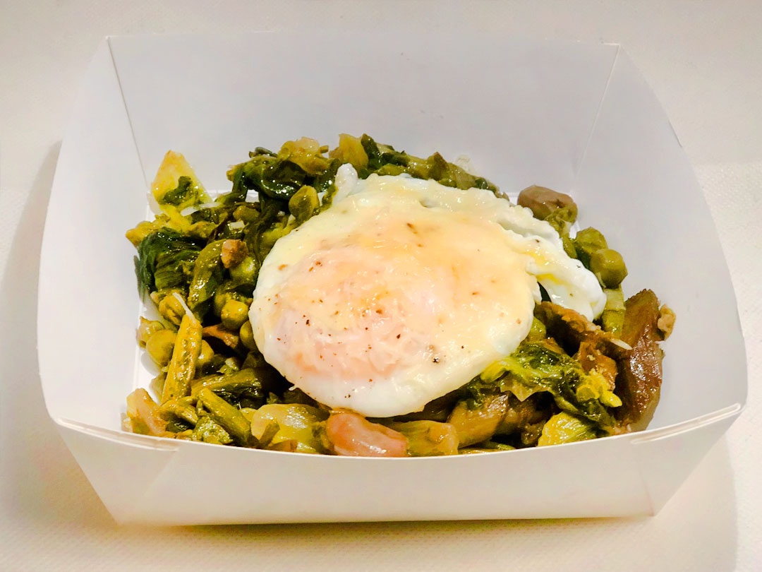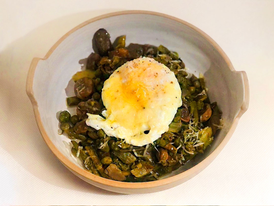 Un piatto primaverile della tradizione romana con verdure di stagione come fave, piselli e carciofi. Noi lo serviamo in abbinamento con l’uovo bio.